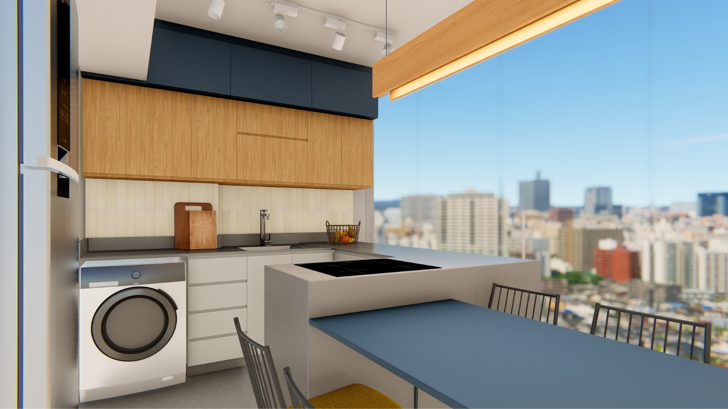 Além do gosto por viagens, a cliente adora cozinhar. Este é o seu momento de relaxar, expressar e receber amigos. Pensando nisso, projetamos a sacada, com a mais nobre vista da sua unidade, para receber o coração do seu apartamento: a cozinha.